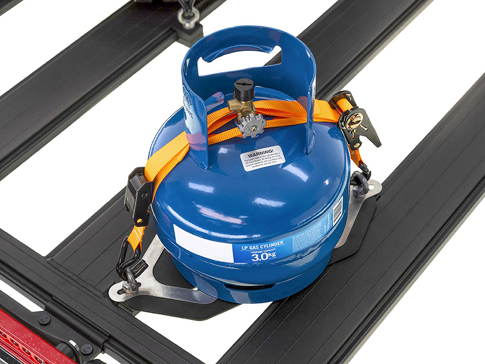 Perfect for carrying a 2kg - 9kg gas bottle, comes complete with the base, ratchet strap and two fixing eye bolts and can be secured to an individual beam or span between beams. Eye bolts and strap included to secure the gas bottle. Durable baseplate with adjustable stainless steel locking bracket.