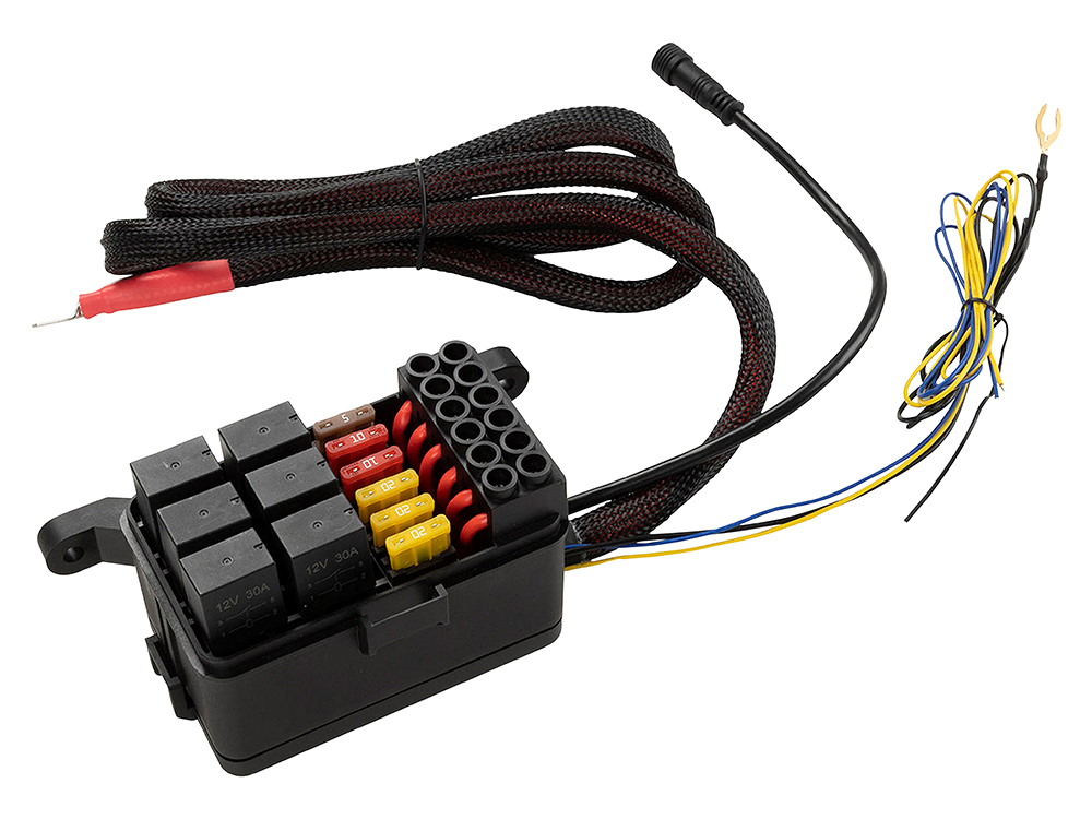The relay box acts like a 12V power distribution hub and provides 6 output channels. Once the relay box high current cable is connected to the battery, the power connection of any load (e.g., lights) involves only one cable from the load to the screw terminal of the box.