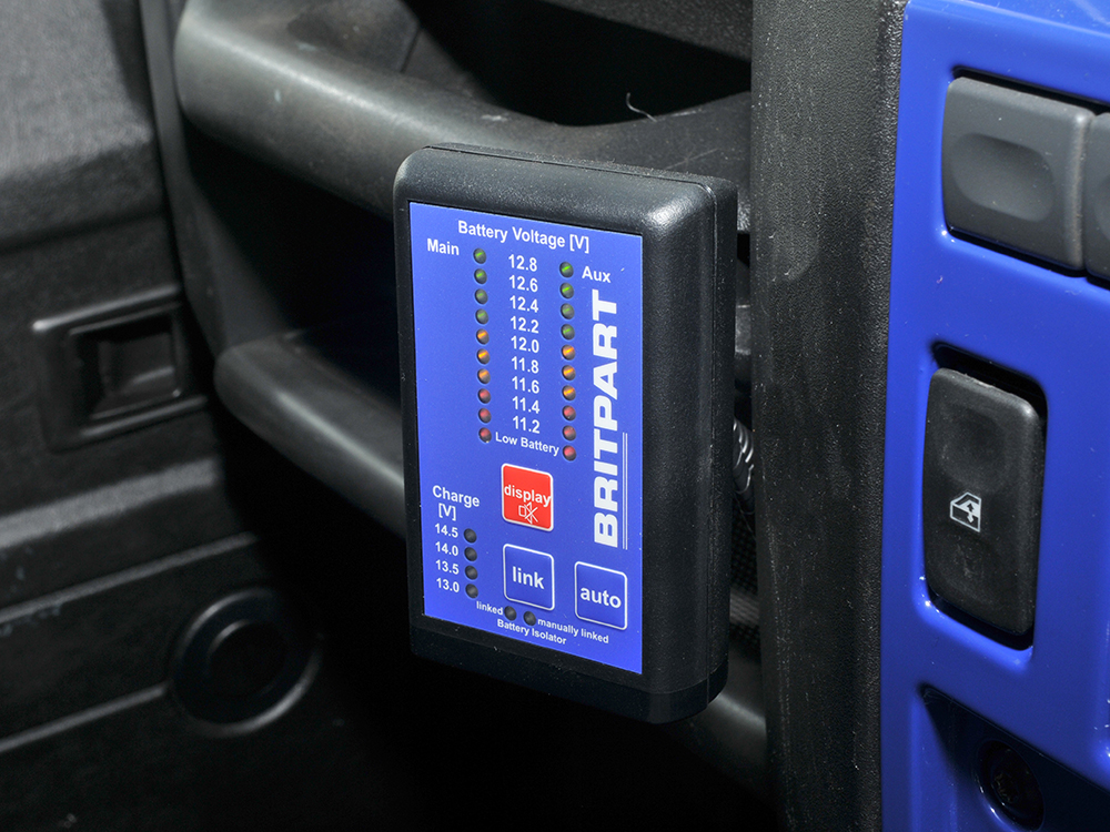 The battery monitor is installed in the vehicle (dash) and informs the driver about the charge level of both batteries, the charging voltage from the alternator or an additionally installed solar system and the relay link status. The system offers low battery alarm on both batteries and a link failure alarm. Includes a manual link for 30 and 120 minutes with automatic return.
