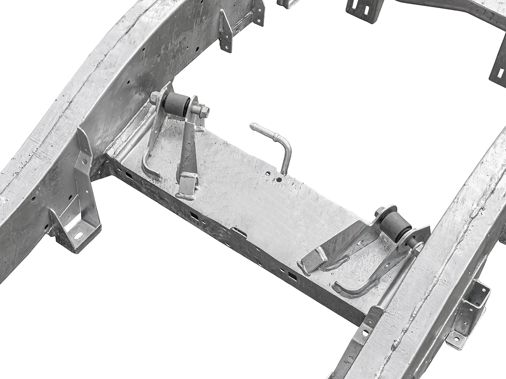 All Defender chassis are built to 2016 type/latest specification, including rear cross member and A-frame cross member. GKN pressed section main legs/rails made from 2mm steel with 3mm stiffeners fitted and spot welded internally for added strength, effectively giving you 5mm of material where most needed. Chassis supplied with bolt in gearbox cross member, rear cross member to body bracket, A-frame to chassis bushes including fixings. Power steering pipe, fuel filter, fuel tank and fuel line riv nuts fitted to chassis. All holes drilled and tapped excluding rear tow pack holes. Galvanised as standard.
