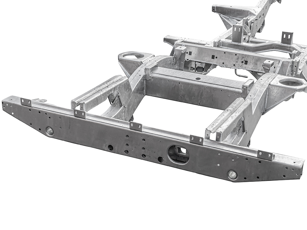 All Defender chassis are built to 2016 type/latest specification, including rear cross member and A-frame cross member. GKN pressed section main legs/rails made from 2mm steel with 3mm stiffeners fitted and spot welded internally for added strength, effectively giving you 5mm of material where most needed. Chassis supplied with bolt in gearbox cross member, rear cross member to body bracket, A-frame to chassis bushes including fixings. Power steering pipe, fuel filter, fuel tank and fuel line riv nuts fitted to chassis. All holes drilled and tapped excluding rear tow pack holes. Galvanised as standard.