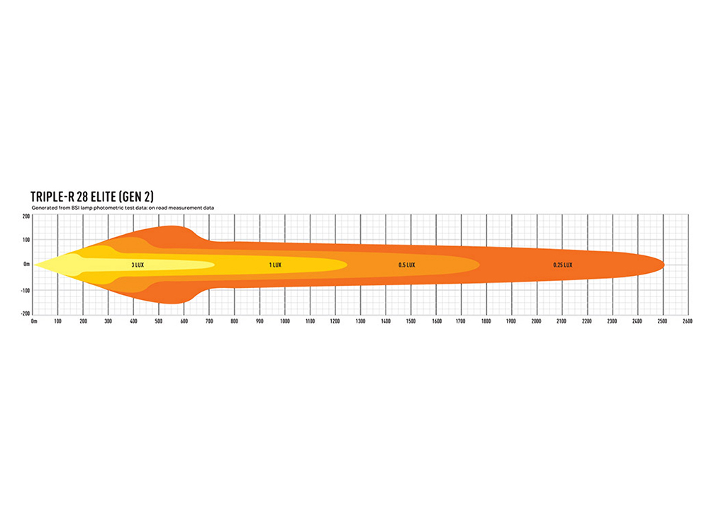 Boasting 28,560 lumen, delivering 1 lux to 1253m, the next generation of Triple-R 28 Elite delivers incredible distance illumination. Still it is through the improved left/right spread of light that this market leading driving light really impresses.