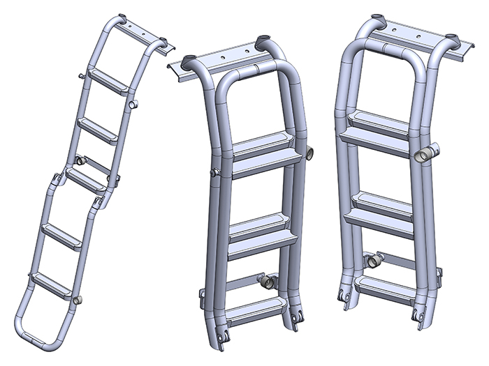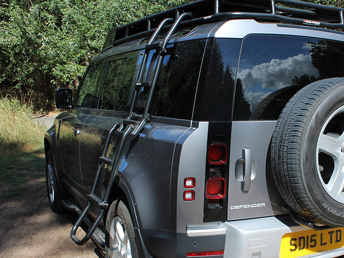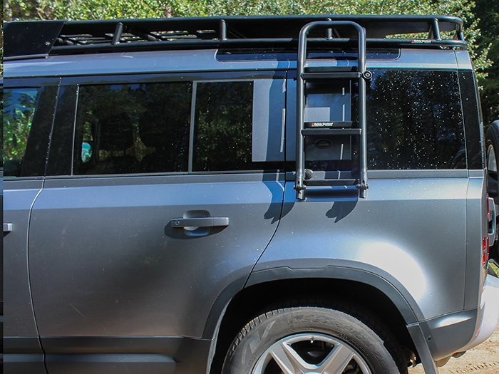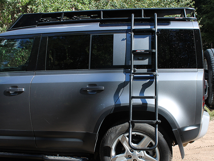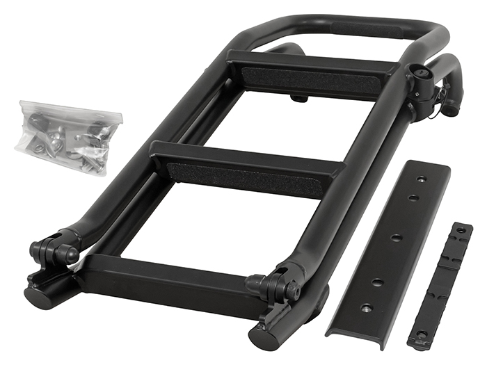 Made of a folding construction with dual securing methods and a key locking mechanism. Requires drilling of the trim panels below the rear window to allow installation into the existing body mounts beneath. When deployed, the height from the floor to the lowest step of the ladder is 585mm at normal ride height (660mm at max and 550mm at min).