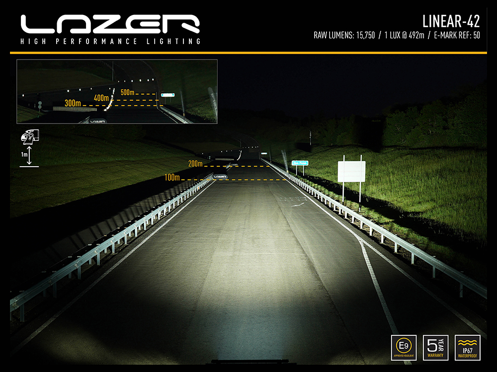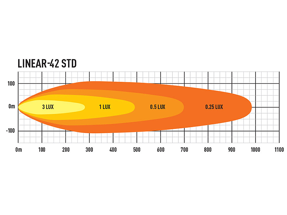 At 1,132mm in length and just 40mm in height, the Linear-42 comprises 42 high density LEDs carefully selected for their premium output rating, colour temperature at 5000 kelvin, and thermal performance (providing improved longevity). Emitting a total of 15,750 lumen, the light delivers 1 lux to 492m via ultra-reflective, vacuum-metallised optics finely tuned to deliver distance illumination at the limit of European road-legal regulations, and an incredible left/right spread of light which makes night-time driving a significantly more pleasant, and safe, experience.