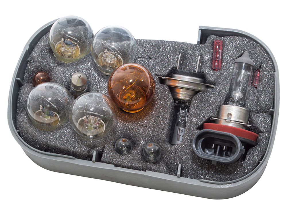 Compact kits for easy storage in glove compartment. Contains major bulbs for exterior lighting and fuses.